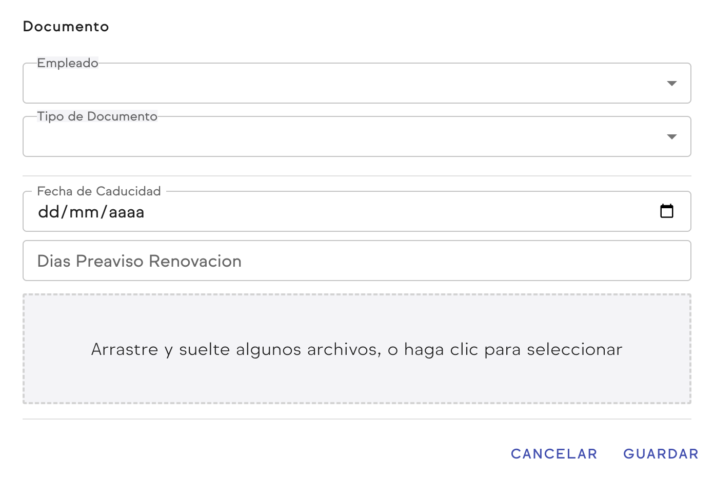 Permite agregar nuevos documentos con facilidad. Al hacer clic en el botón "+" en la esquina inferior derecha, se abrirá una ventana emergente donde se completarán los siguientes campos: