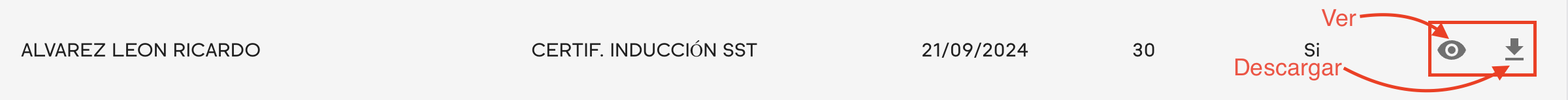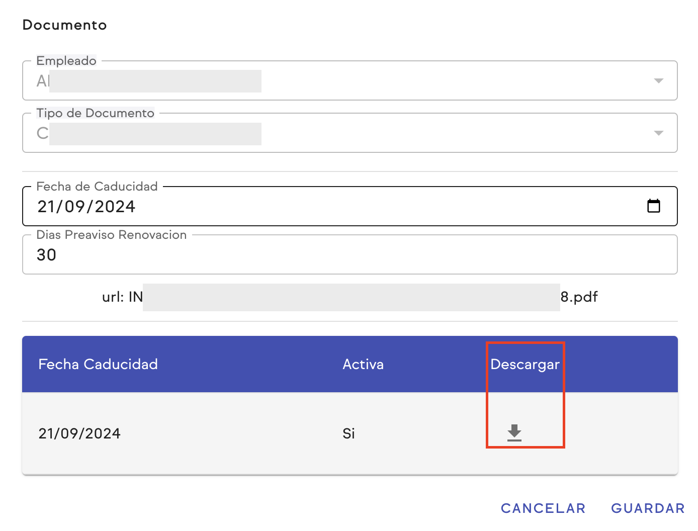 Tabla con detalles adicionales como fecha de caducidad, estado y opción de descarga del documento adjunto.