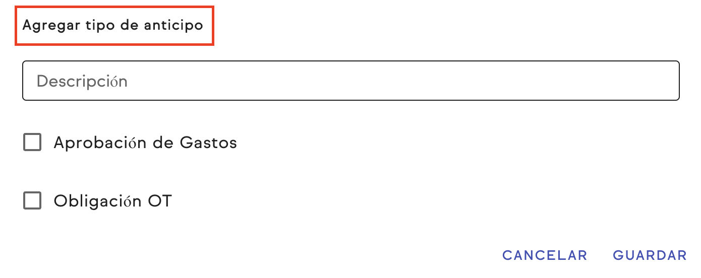 Para crear un nuevo tipo de anticipo, haz clic en el icono "+" en la esquina inferior derecha. Luego, completa los siguientes campos en la ventana emergente: