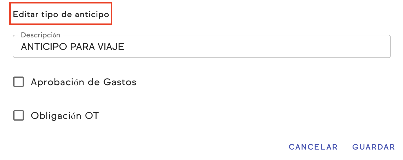 Cada registro en la tabla tiene un botón de edición que te permite modificar los detalles del tipo de anticipo.
